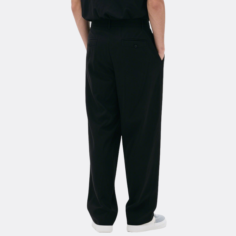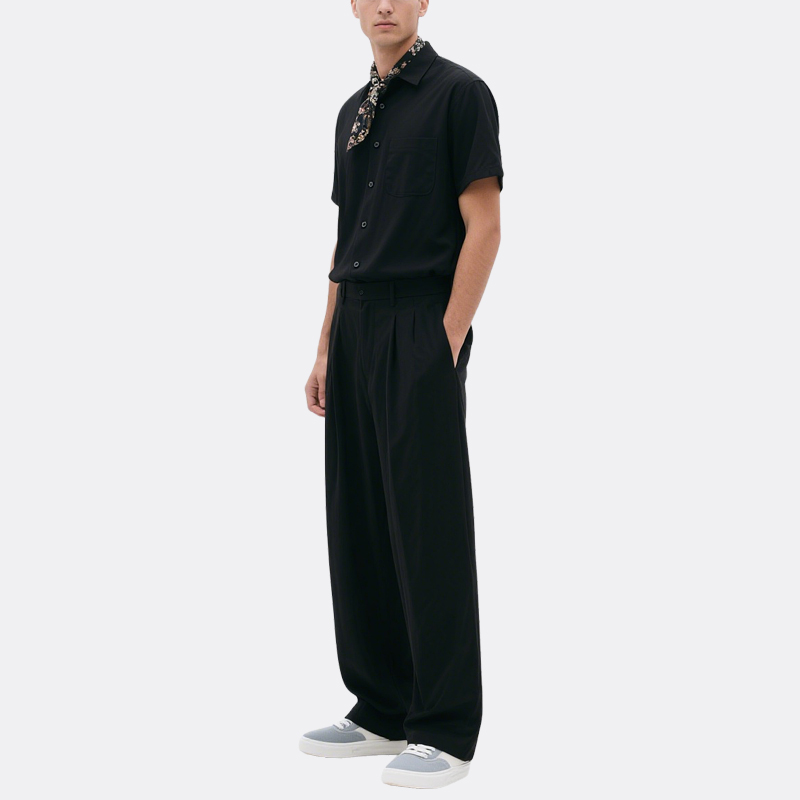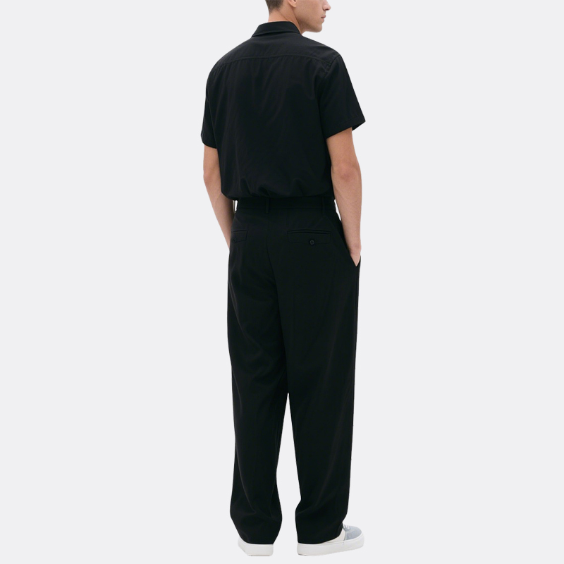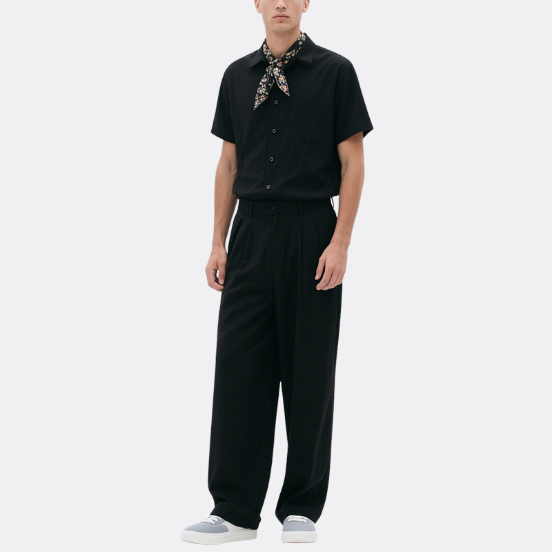 Pants: Relaxed-fit trousers with a streamlined silhouette and subtle crease detailing, offering ease of movement and a modern edge.