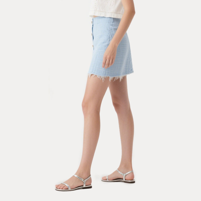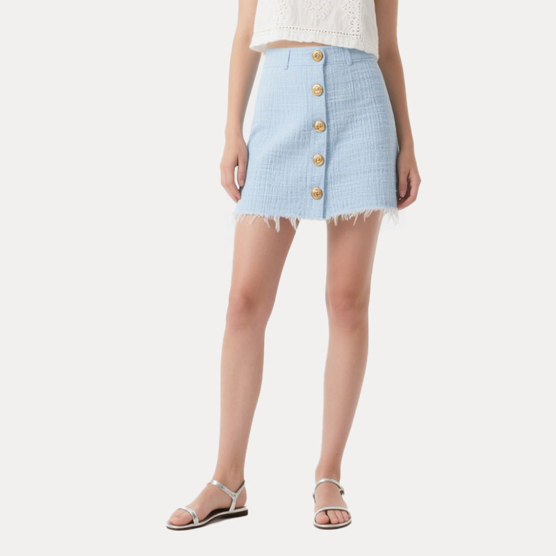 Classic meets casual in this vintage-inspired mini. Made from a textured polyester-blend tweed, this high-waist skirt features bold gold-tone buttons and raw-cut hems for an effortless, undone finish. Perfect for styling with a tucked-in tank or cropped blouse.