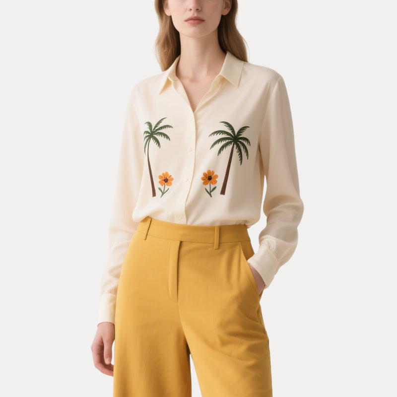 Cream Women’s Shirt with Palm Tree Embroidery Long Sleeve Button Up Top