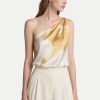 This one-shoulder top for women is made from 90% polyester and 10% spandex. It is soft and lightweight, yet comfortable and durable.