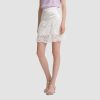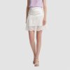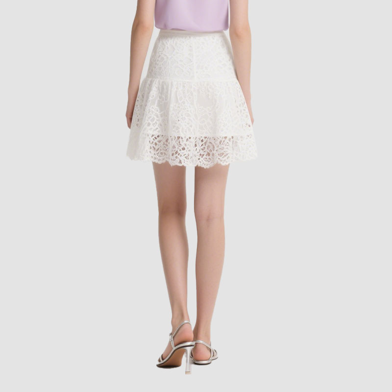 Feminine and flirty, this mini skirt pairs smooth satin with delicate floral lace for an effortlessly romantic look.