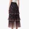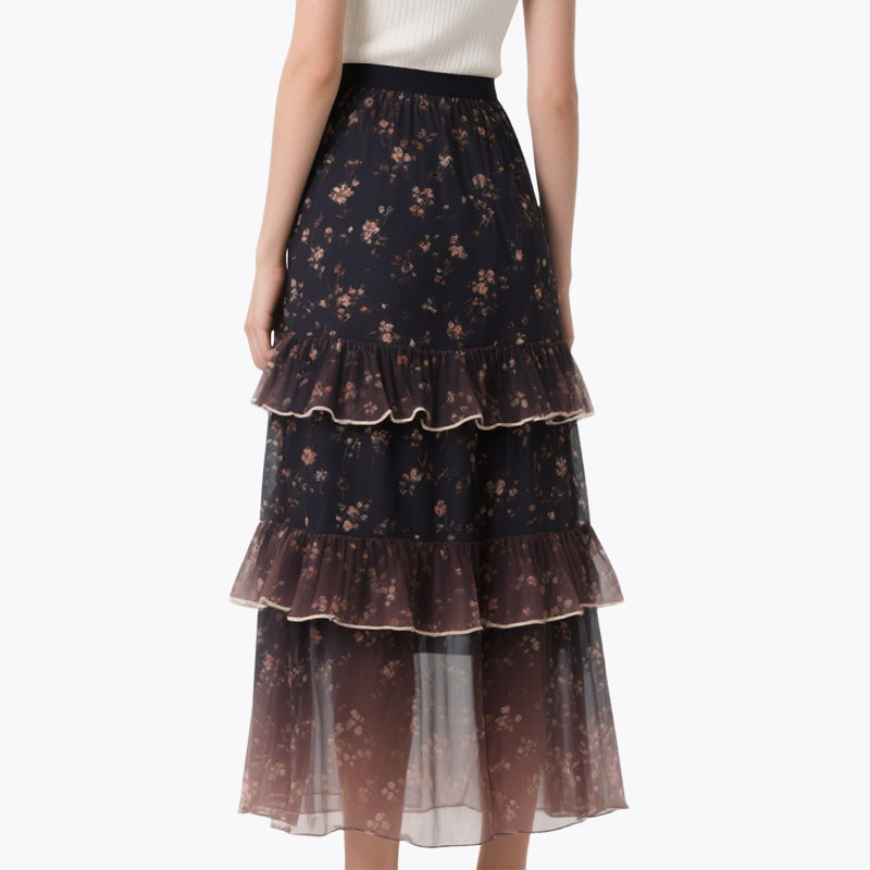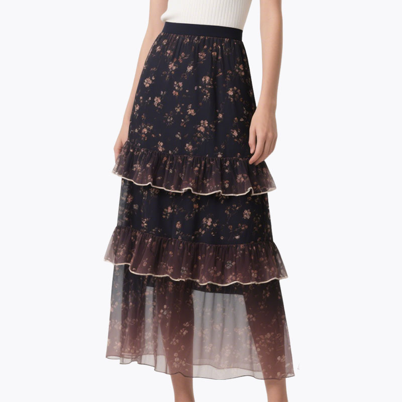 Features three cascading tiers with soft tulle ruffles, adding dimension and movement. The inner layer combines sheer gray tulle for ethereal volume.