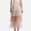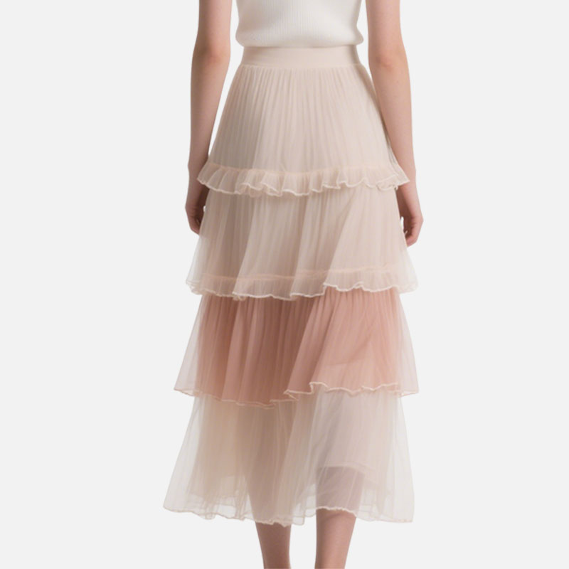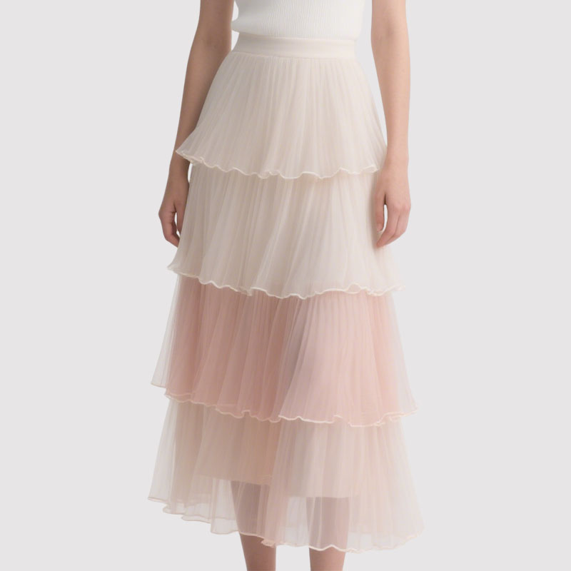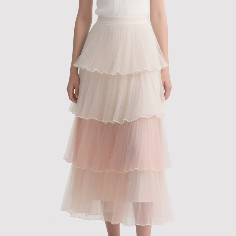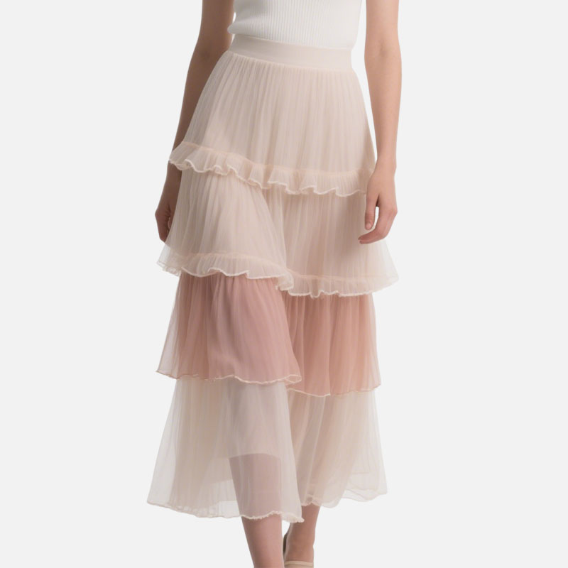 Delicate Details​: Soft ecru to blush-pink ombre effect with 3 distinct chiffon tiers. Scalloped hem edges on each tier create romantic movement.
