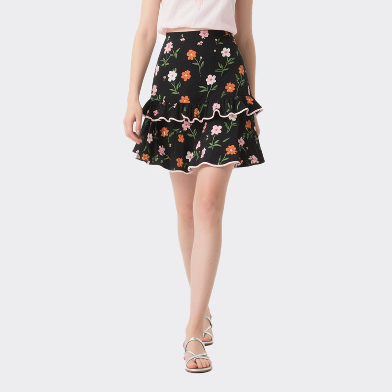 Bring playful charm to your wardrobe with this floral ruffle mini skirt. Designed with a flattering A-line silhouette and double-tiered hem, it moves beautifully with every step.