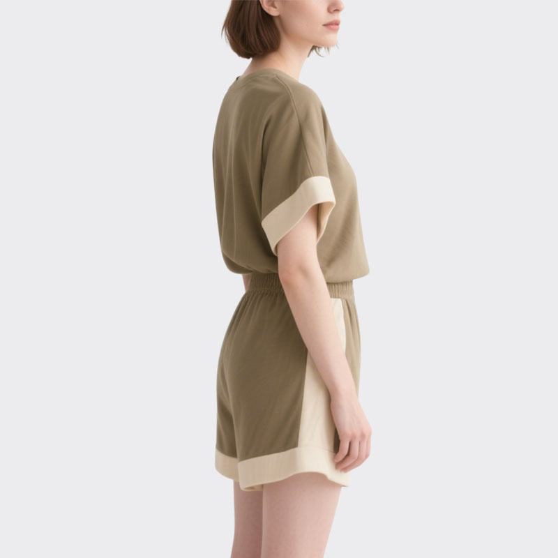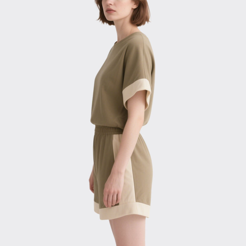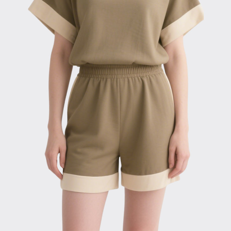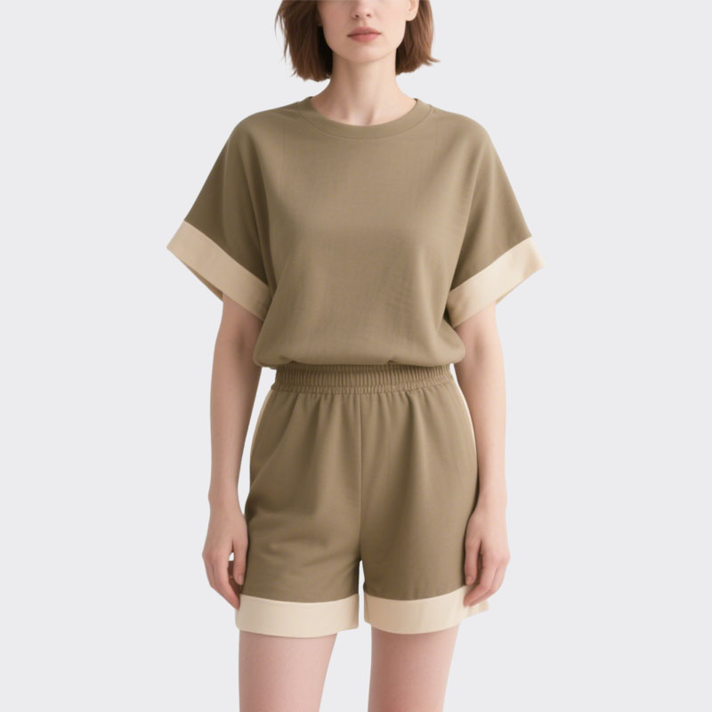 Khaki Contrast Trimmed Tee & Shorts Set Women’s Summer Sportswear