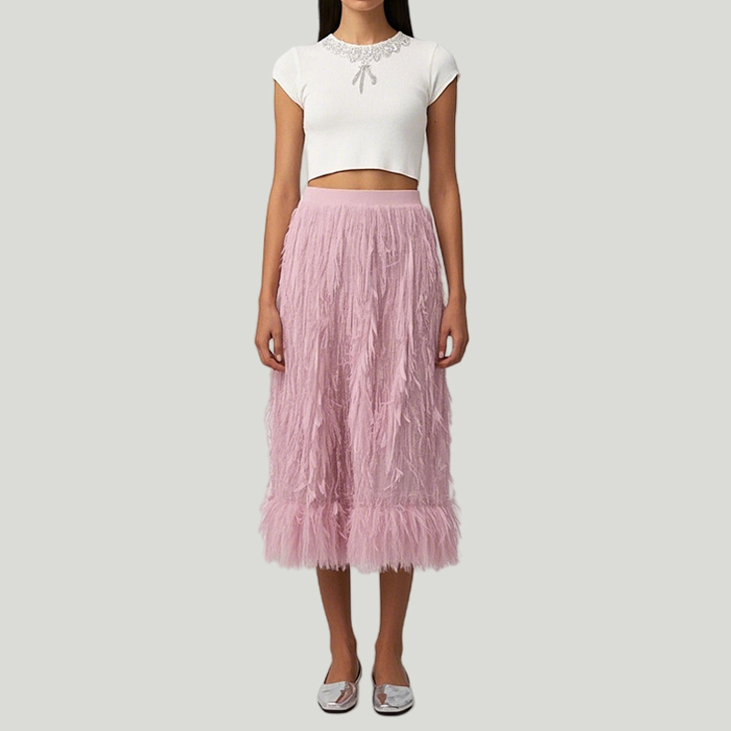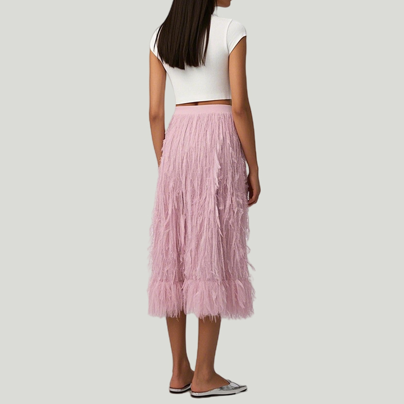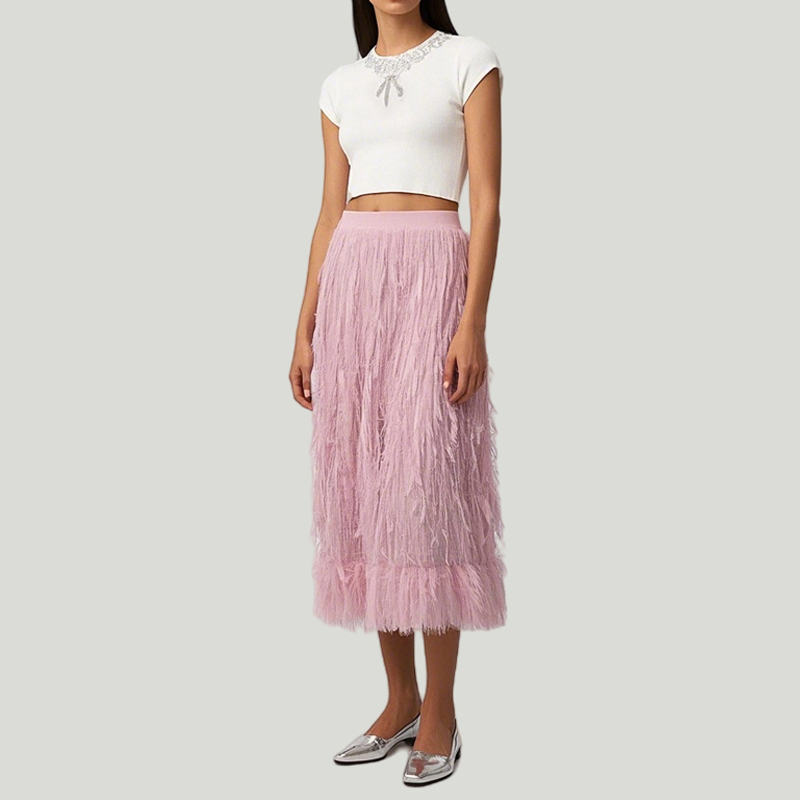This midi skirt features a trendy pink fringe design. The flowing fringes add movement, and the high – waisted style flatters the figure.​