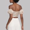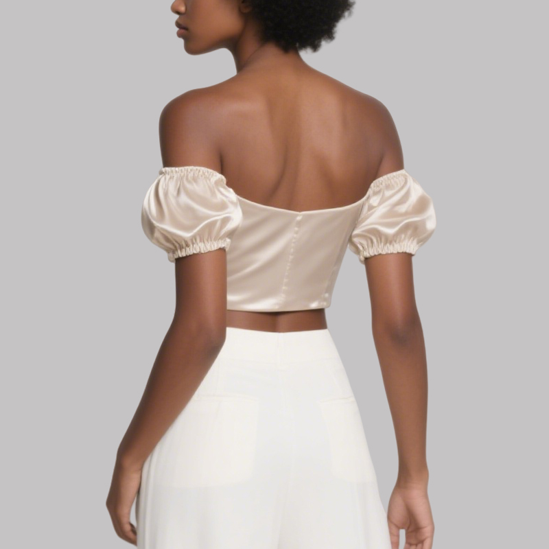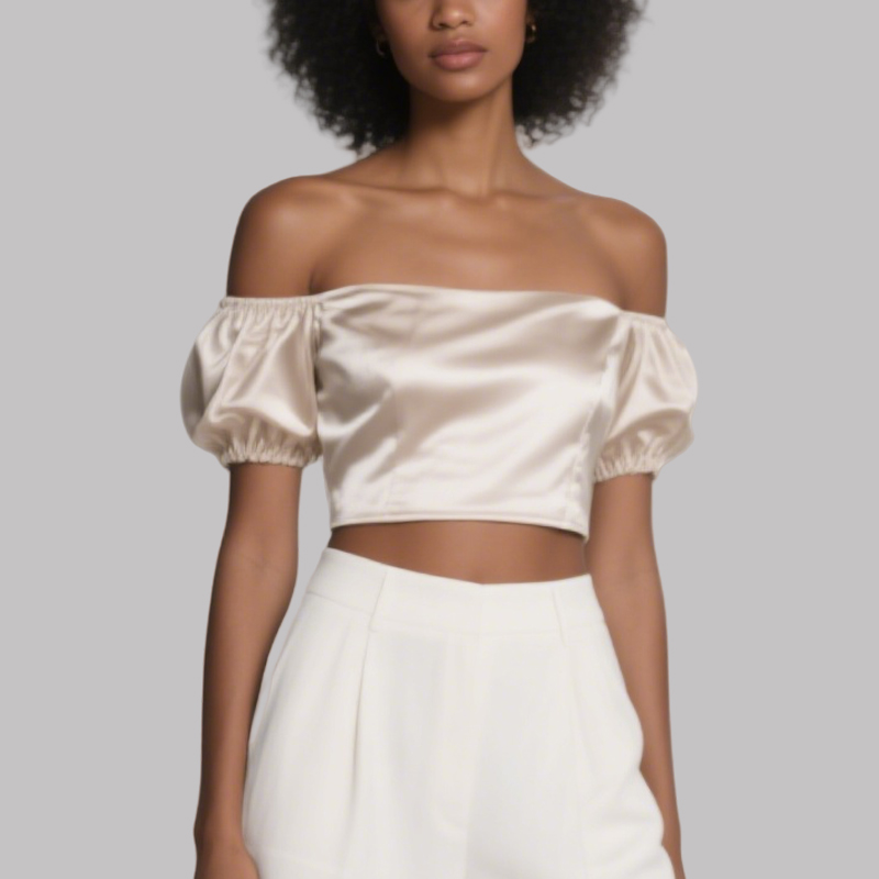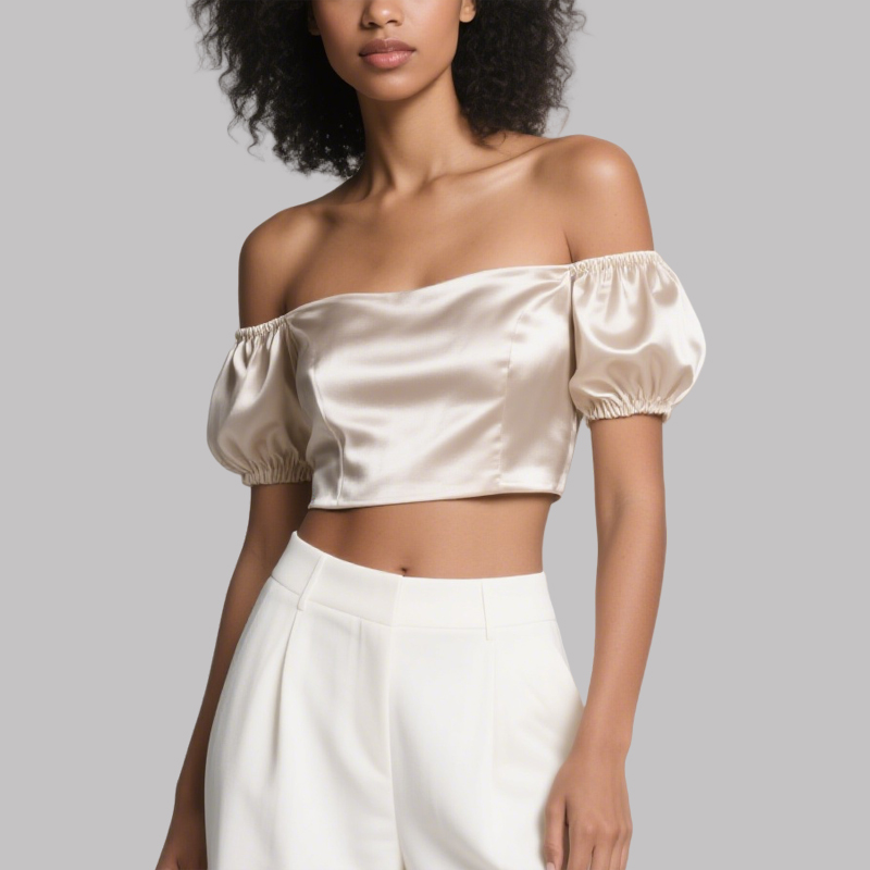Sustainable Crop Design: Modern off-the-shoulder cut reveals midriff, balancing daring femininity with refined proportions.