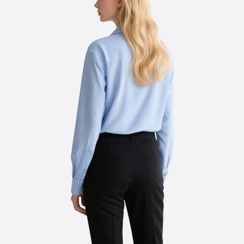 Classic Button – Down Silhouette: Features a crisp collar and a tailored fit that flatters various body shapes. The timeless design ensures it never goes out of style, making it a reliable wardrobe staple.
