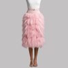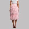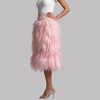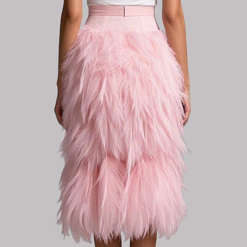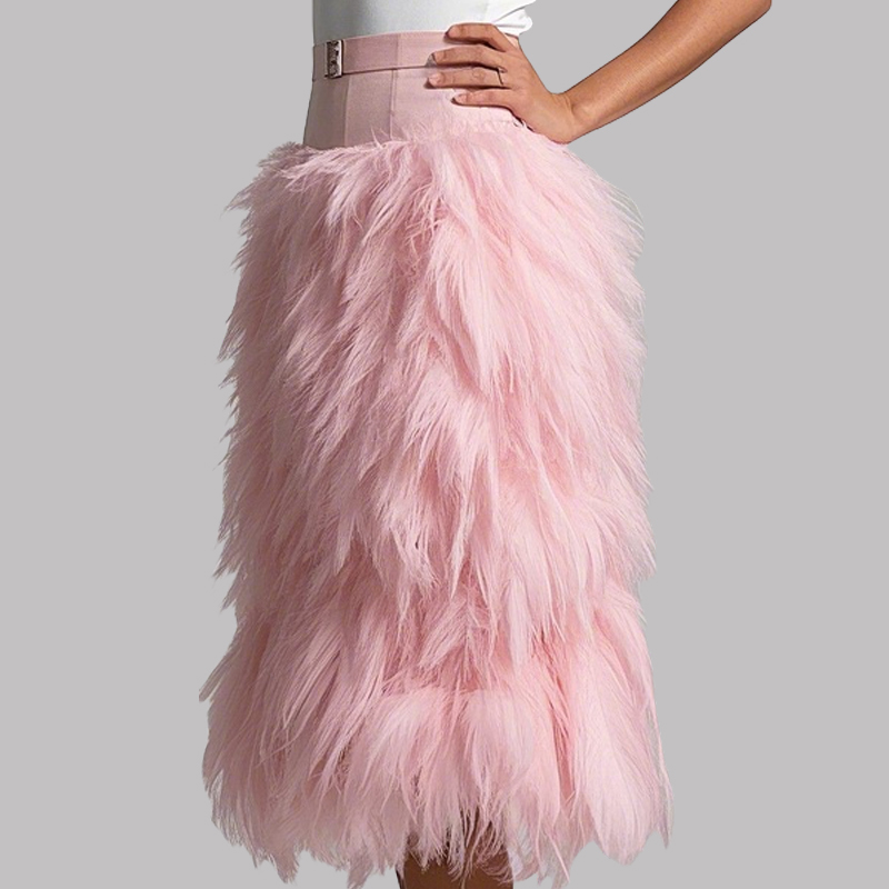 Adorned with cascading pink feathers, this high – waisted midi skirt features a sleek belt to accentuate the waist. Its vibrant hue makes it a statement piece.