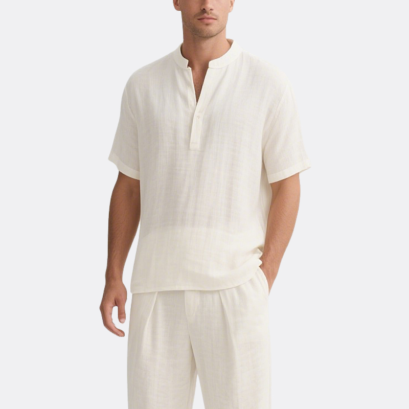 Shirt: Mandarin collar with minimalist button placket; loose, untucked silhouette for effortless polish.