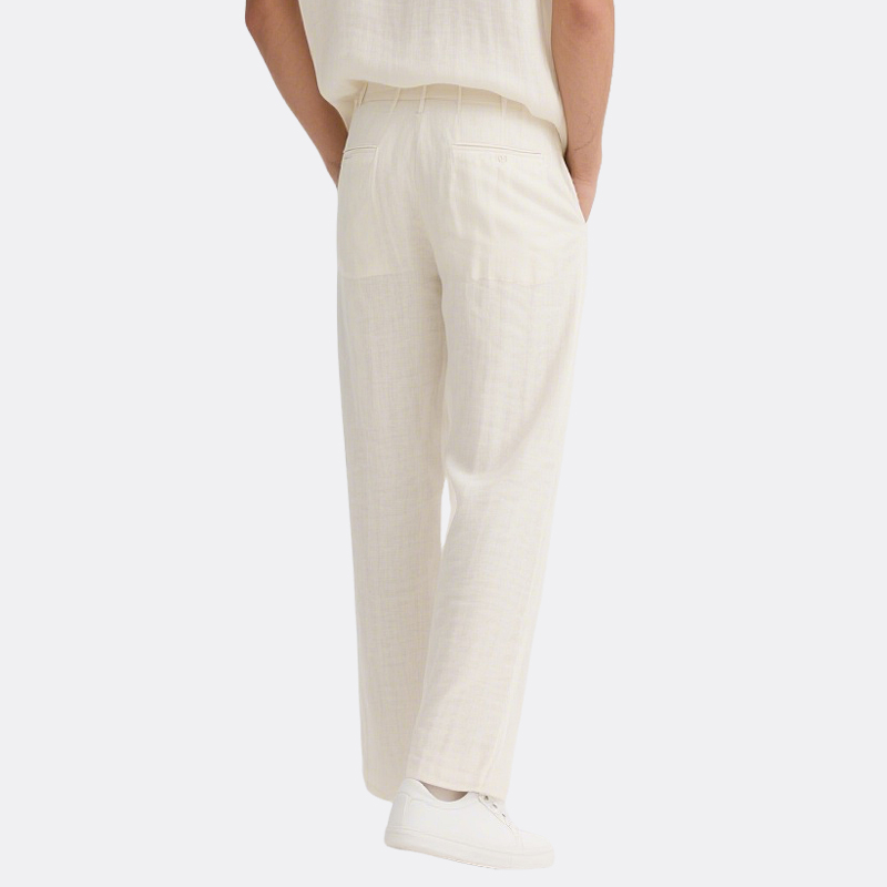 Pants: Relaxed straight-leg cut with subtle pleats at the front; wide waistband ensures comfort without sagging.