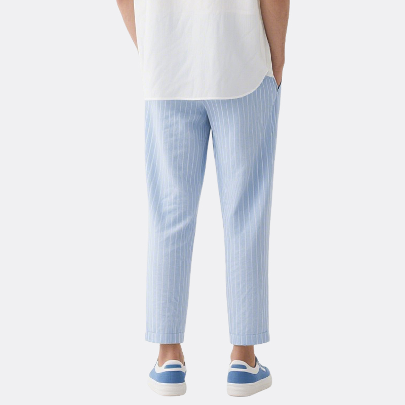 Blue Striped Tapered Pants: Slim-fit stripes add subtle texture; elastic waistband with drawstring ensures a comfortable, customizable fit.