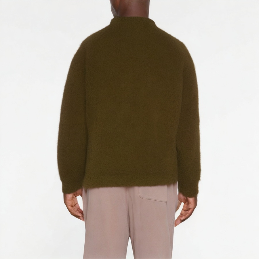 Mohair knitted jacquard fabric: This sweater is made of high-quality mohair material, and its fluffy and soft texture brings excellent warmth to the wearer. Mohair has natural elasticity and warmth retention, while not losing comfort, especially suitable for wearing in cold seasons. The jacquard process makes the sweater surface present a unique pattern, adding a visual sense of layering.