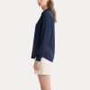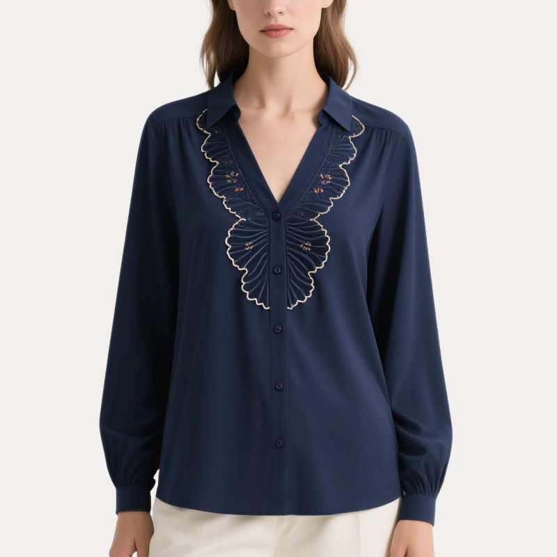 Navy Blue Women’s Shirt with Embroidered V-neck Long Sleeve Blouse