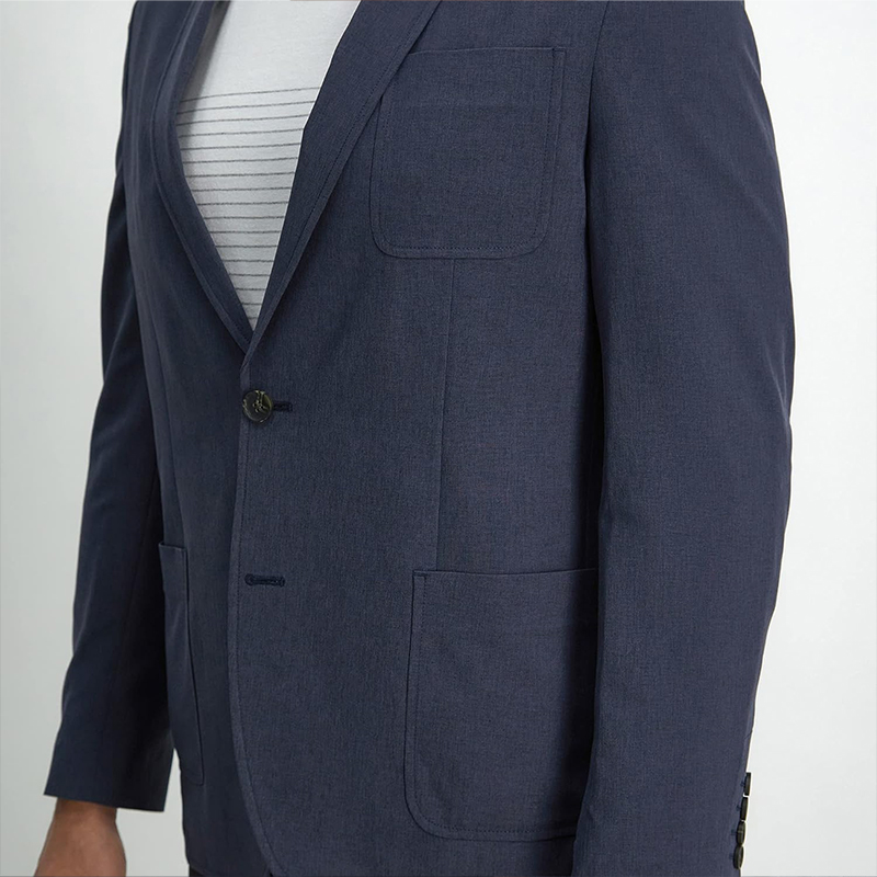 - ?Functional design: With two buttons, notched lapels, side slits, four cufflinks and patch pockets, the interior is unlined and the hemmed seams show a casual atmosphere, which is both practical and fashionable.