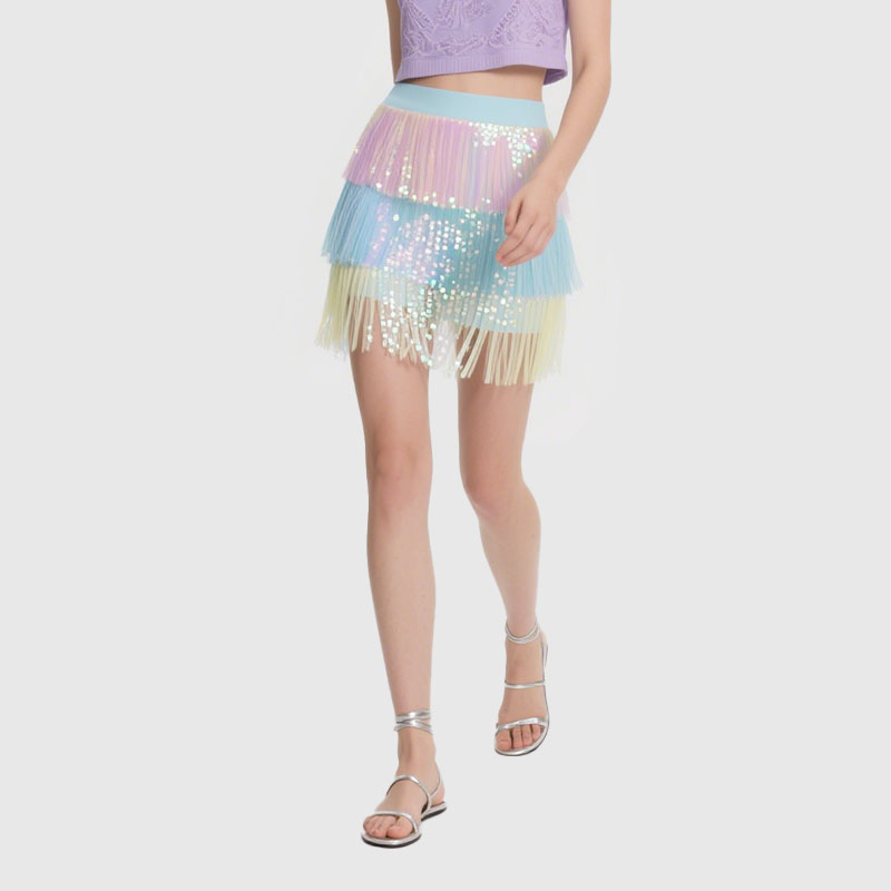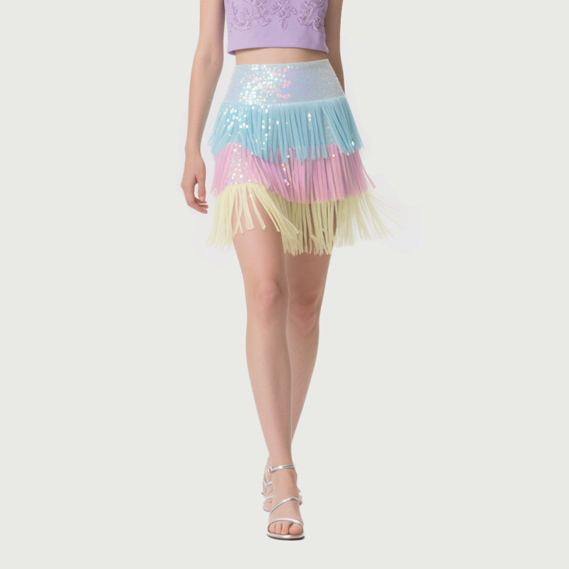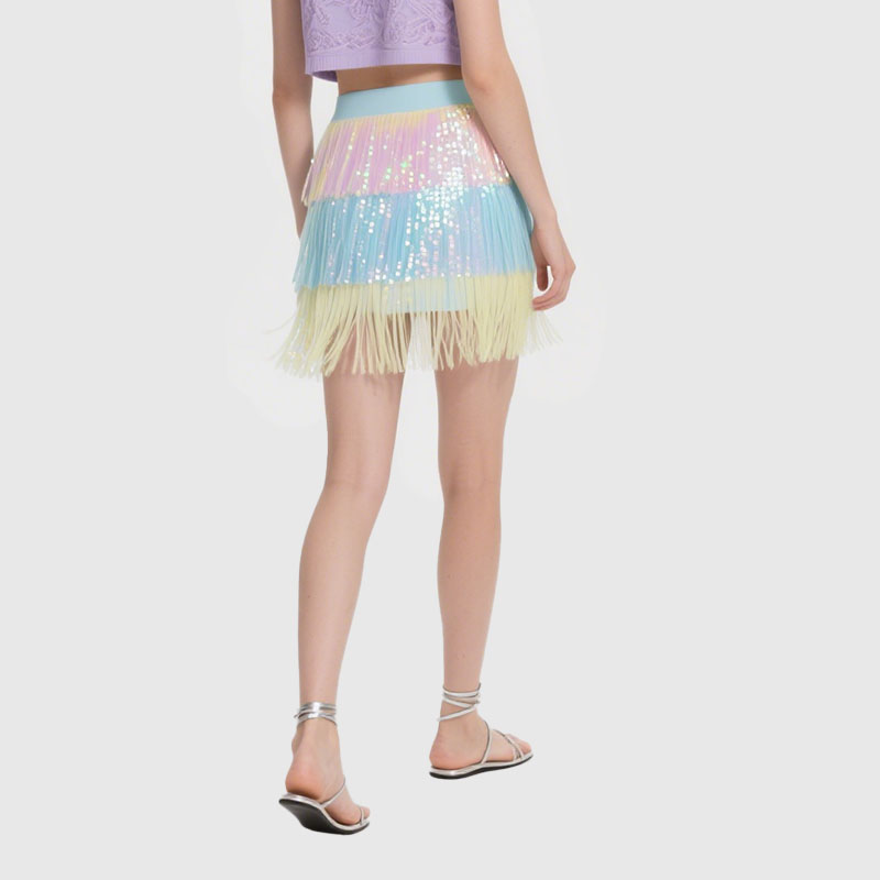 Turn heads with every step in this dazzling rainbow mini skirt — designed for movement, sparkle, and standout style.
