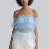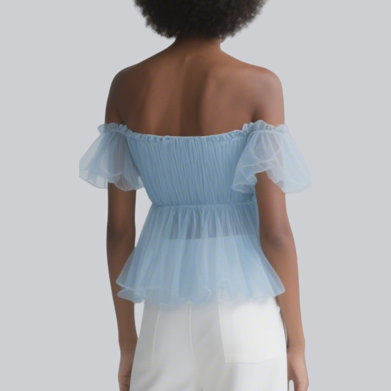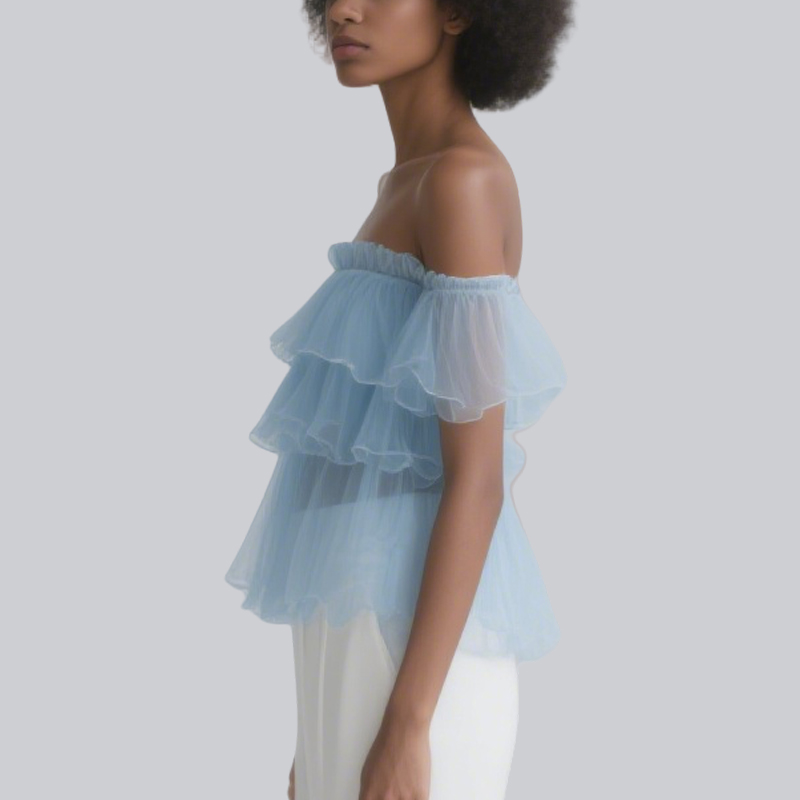 Floaty, flirty, and effortlessly feminine. This airy off-shoulder top features layered ruffles and a sheer silhouette—perfect for your next brunch or beach getaway.