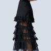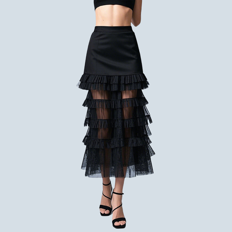 This midi skirt features a trendy design. The multiple layers create a sense of movement and fullness, while the lower part made of sheer lace adds a touch of allure and sophistication. It’s a perfect blend of elegance and modern fashion.