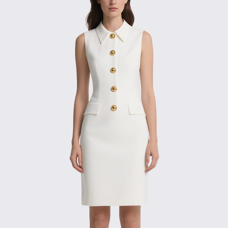 Gold Button Detailing: Five oversized gold buttons create a vertical line, elevating the dress with luxury.