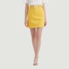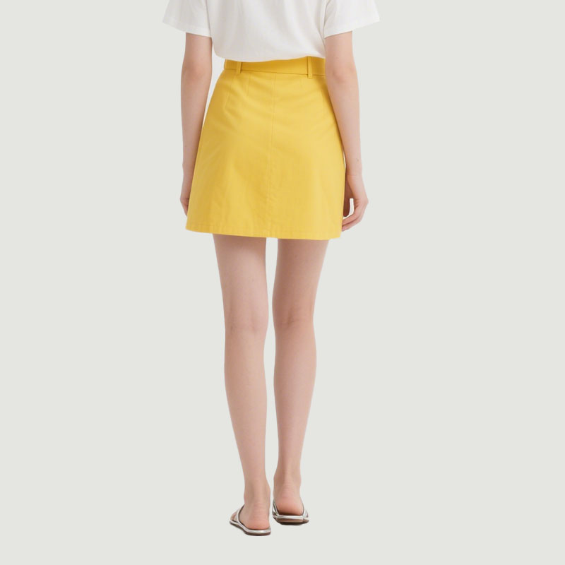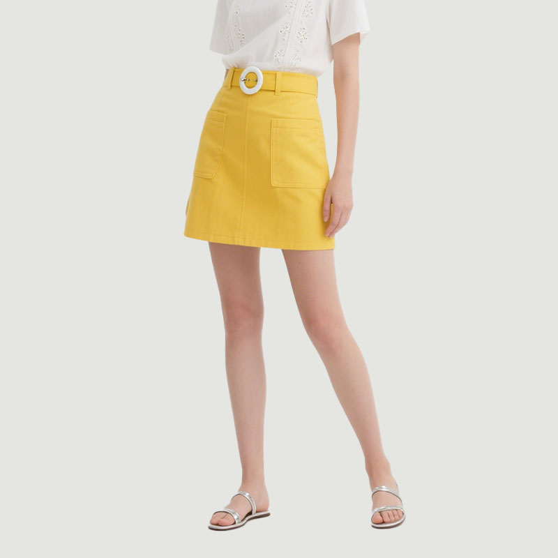 Brighten your wardrobe with this vibrant yellow mini skirt. Designed with a flattering high waist, bold oversized buckle belt, and utility-inspired patch pockets, it brings playful structure to any outfit.