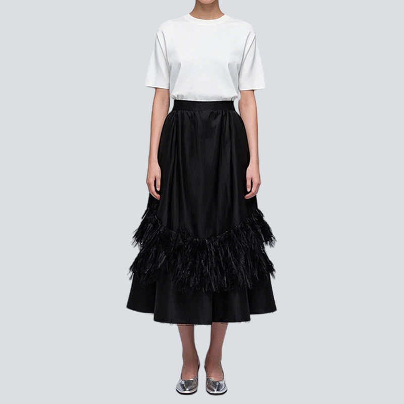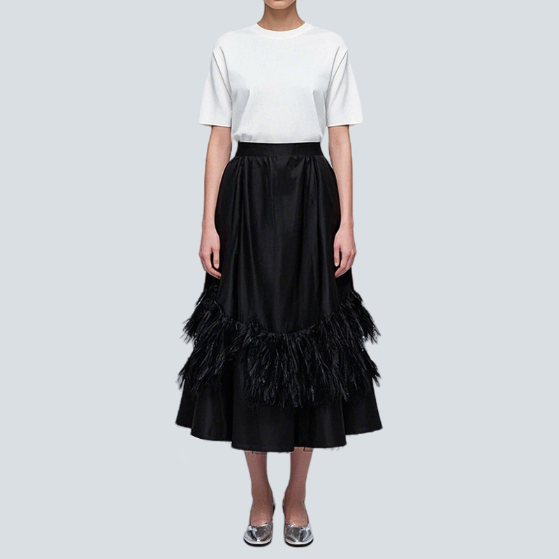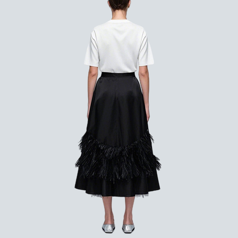 This black midi skirt mixes sophistication with style. Satin fabric offers a sleek, lustrous base, while feather layers add drama. The high – waisted cut flatters all body types.