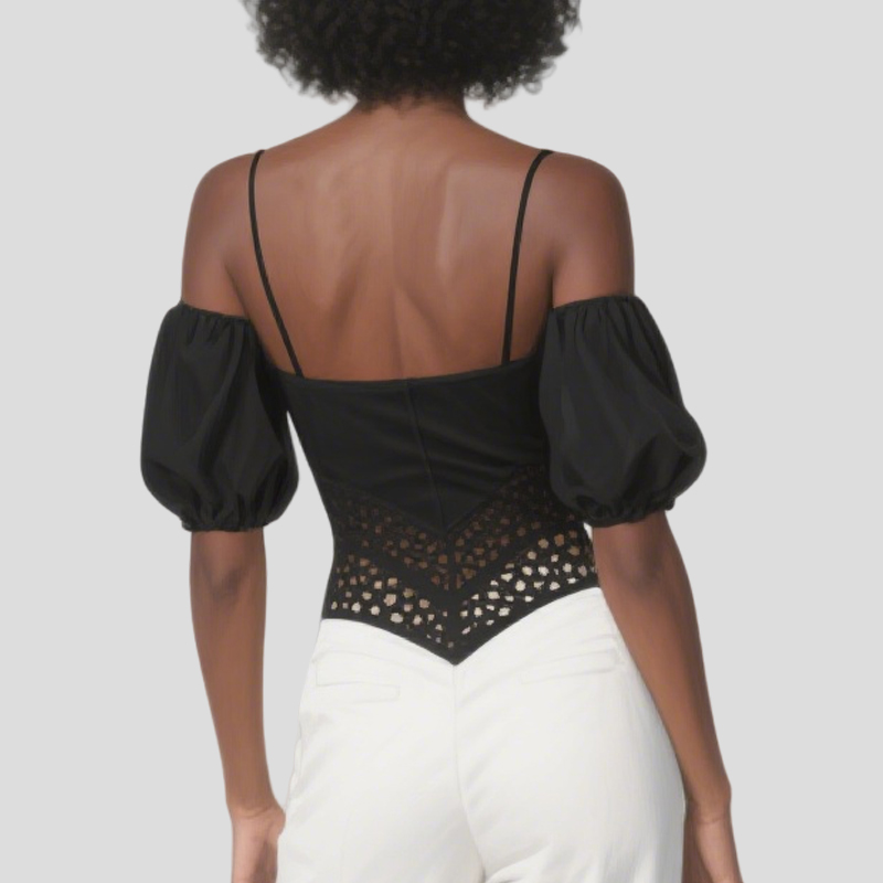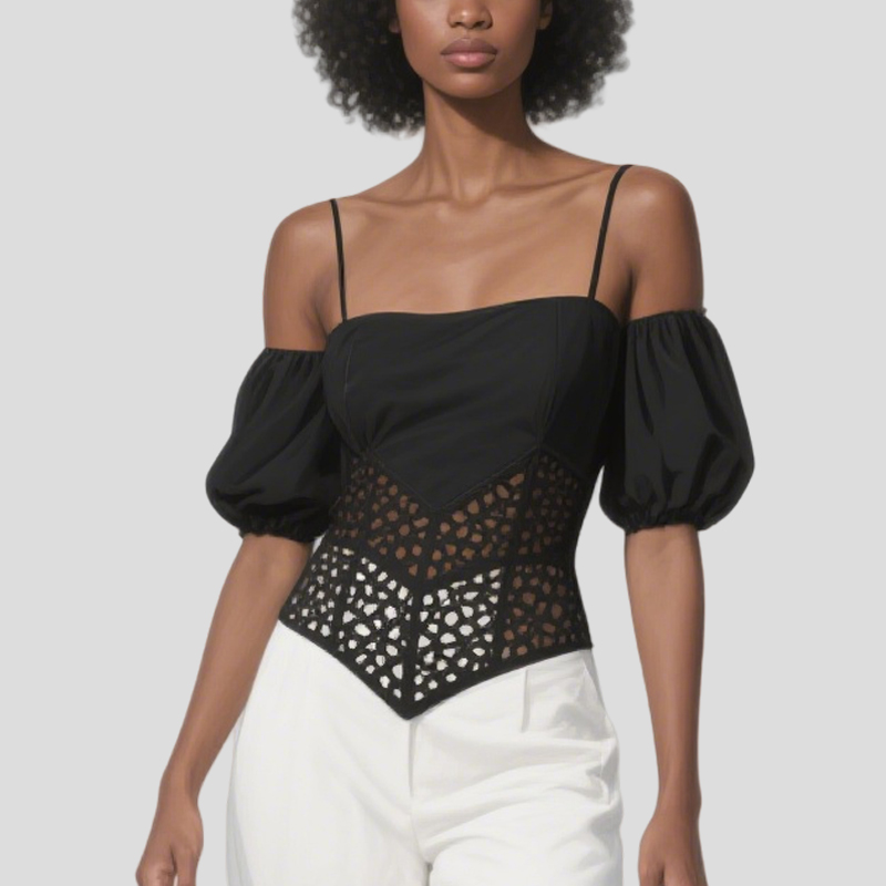 Crafted from premium polyester-blend fabric, this statement top combines sophistication with modern flair.