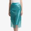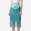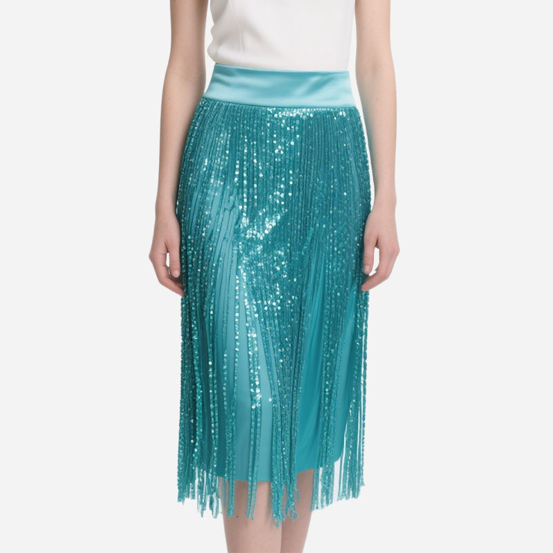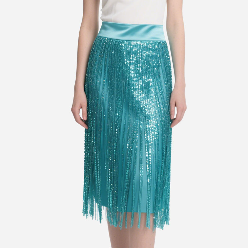 Crafted in a captivating turquoise hue, this high-waisted midi skirt features a sleek silhouette with a satin waistband for instant sophistication. The knee-length cut balances proportion and movement, perfect for both day and night.