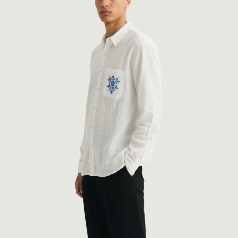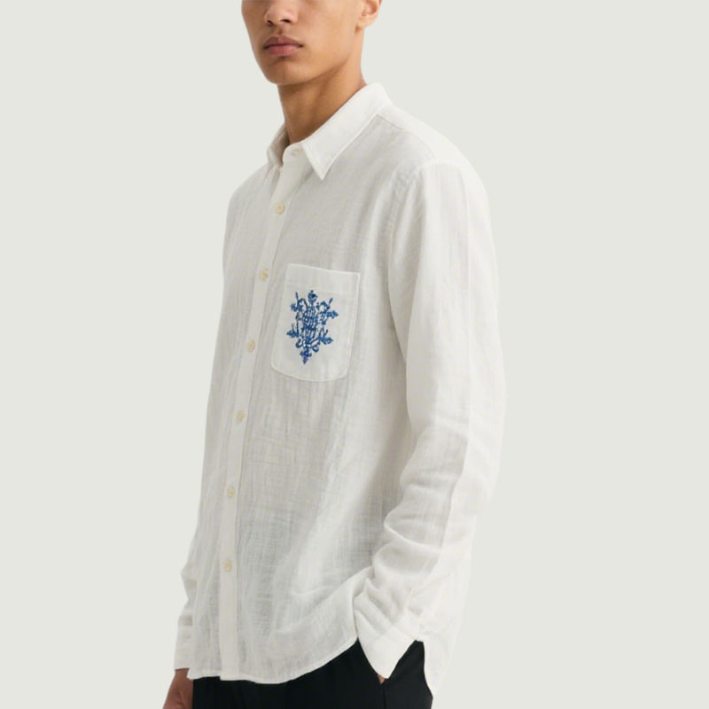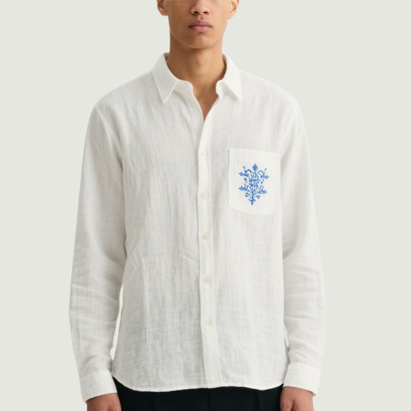 Trendy Blue Flower-Decorated Pocket White Men’s Linen Shirt