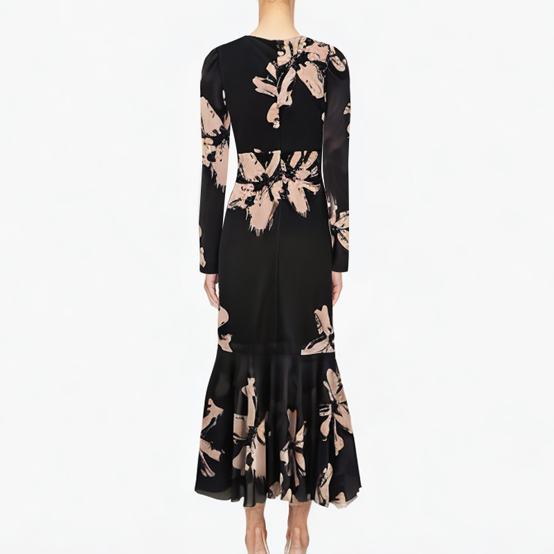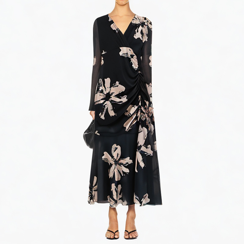 Packing list: V-neck printed long-sleeved pleated black dress * 1