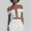 Design: Off-shoulder neckline with front ring hardware detail