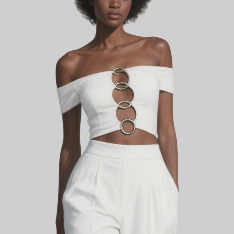 Make a statement with this edgy off-shoulder crop top featuring four bold metallic ring cutouts. Sleek, daring, and made to stand out—your new go-to for nights out or festival fits.