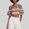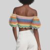 Crafted from premium soft cotton-blend yarn, this eye-catching cropped sweater features bold, horizontal rainbow stripes in cobalt blue, mint green, peach, coral, ivory, and lemon yellow. The playful wavy hem adds a whimsical touch, while puffed sleeves with ribbed detailing enhance vintage charm.