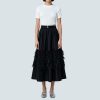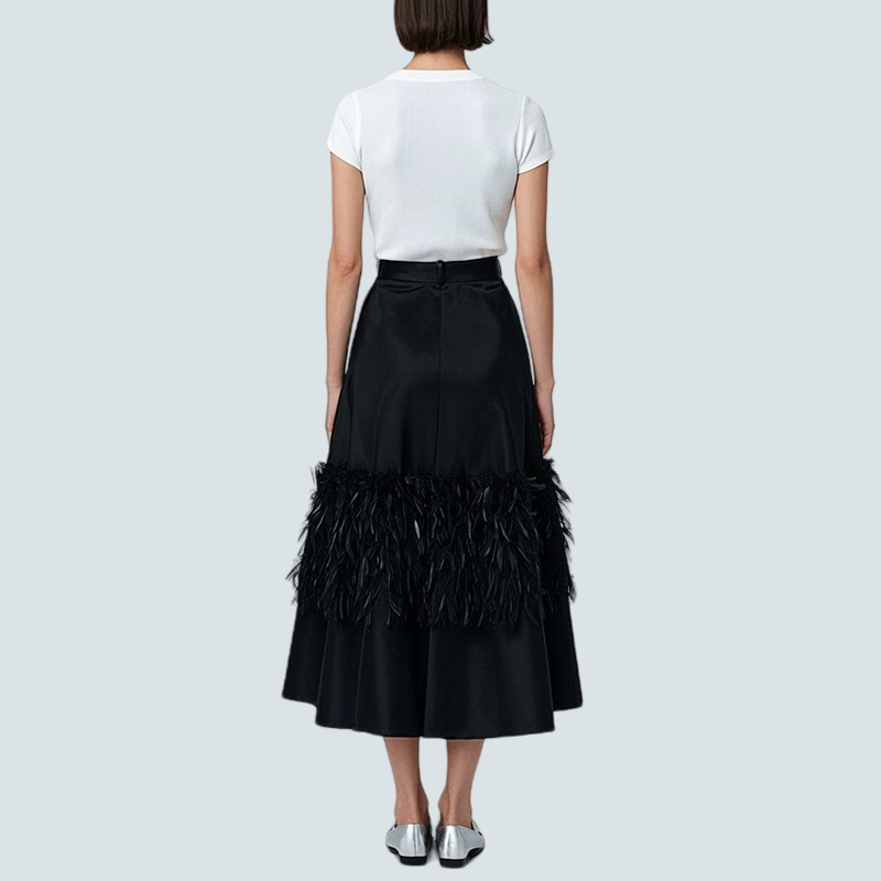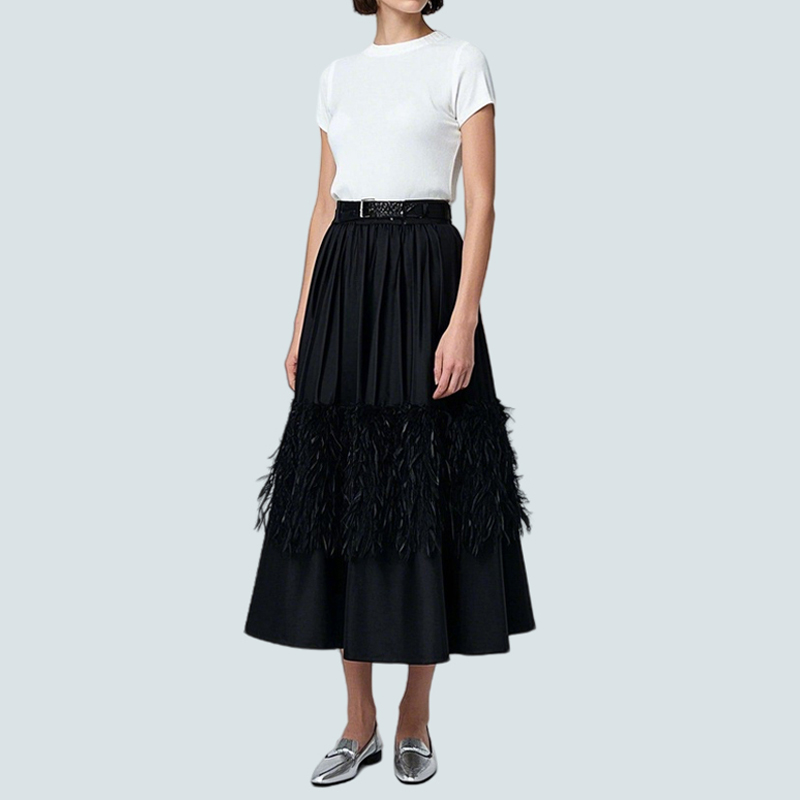 This black midi skirt blends elegance with trend. Pleated upper and feather – trimmed lower sections create a refined, dynamic silhouette. High – waisted with belt detail flatters the figure.