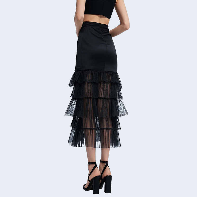 The skirt is crafted from high – quality materials. The main part is made of a durable polyester blend fabric that offers a sleek look and comfortable fit. The lace used in the lower layers is a fine – quality nylon blend, which is soft to the touch and has good elasticity.