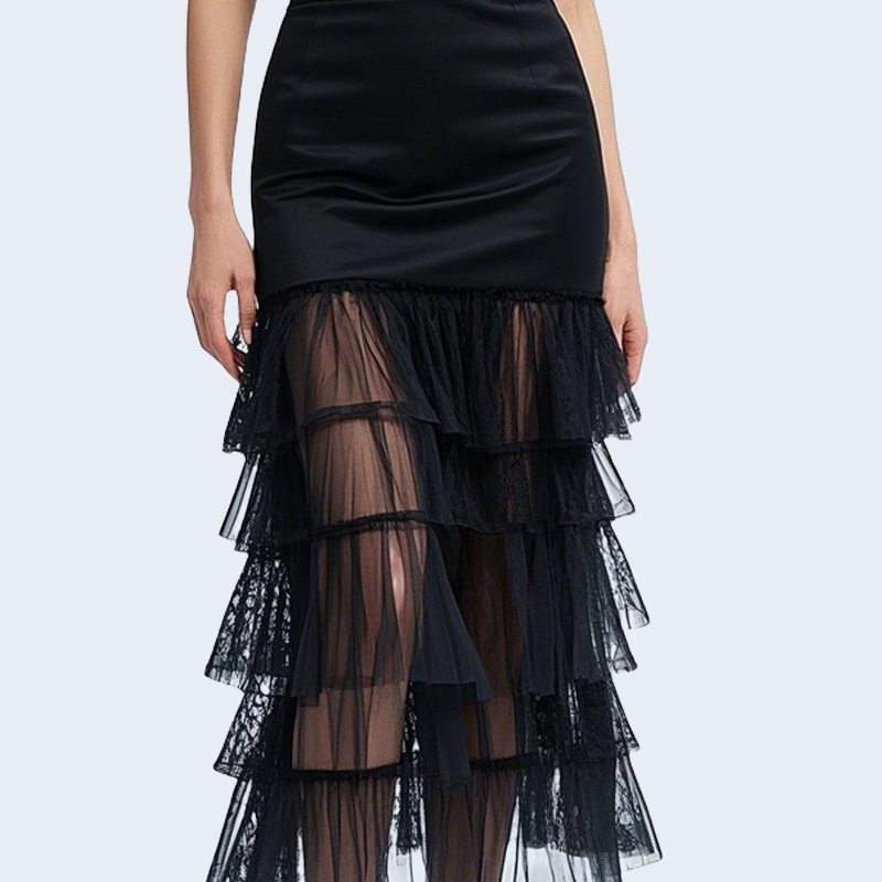 This midi skirt features a trendy design. The multiple layers create a sense of movement and fullness, while the lower part made of sheer lace adds a touch of allure and sophistication. It’s a perfect blend of elegance and modern fashion.
