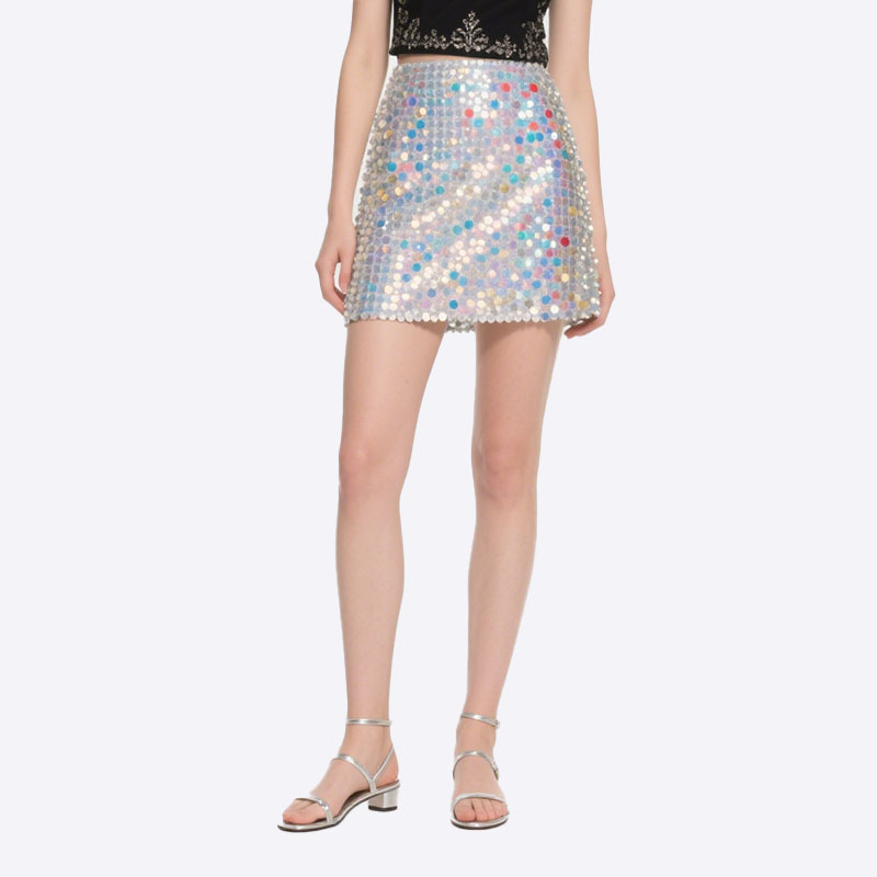 Make a statement. This dazzling mini skirt is covered in large iridescent sequins that catch the light from every angle. Crafted from a durable polyester base with sequin overlay, it’s perfect for parties, festivals, and nightlife looks.