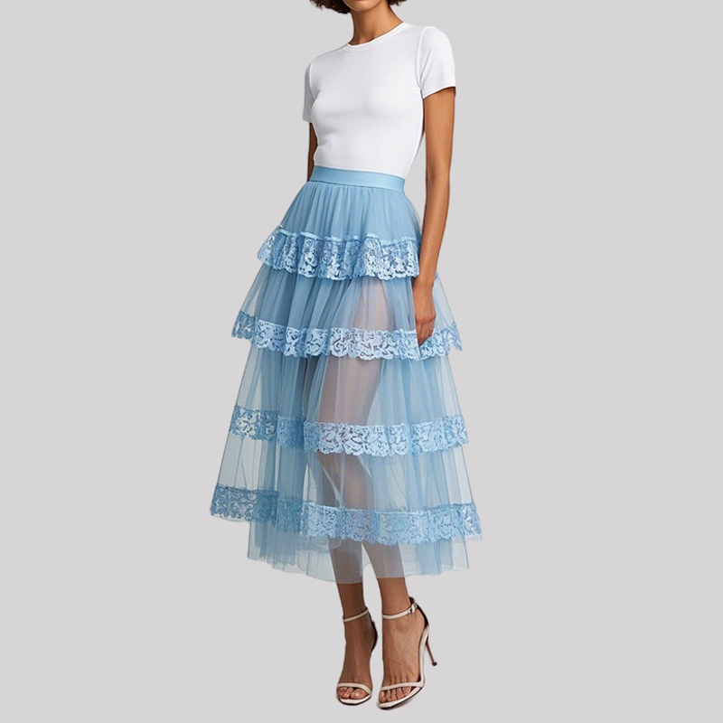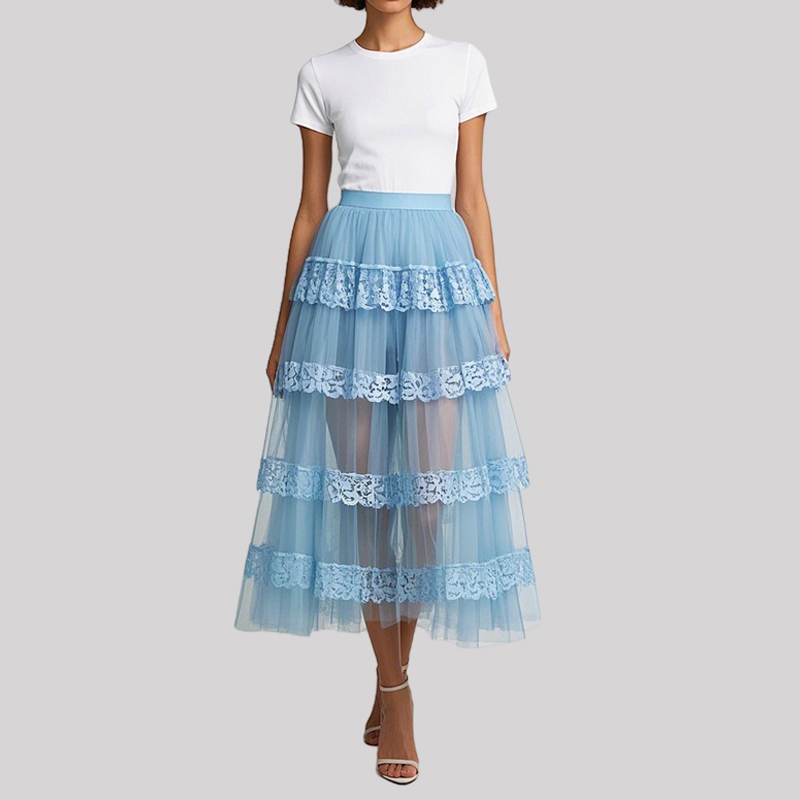 This midi skirt features a trendy design. The multiple layers create a sense of movement and fullness, while the lower part made of sheer lace adds a touch of allure and sophistication. It’s a perfect blend of elegance and modern fashion.