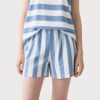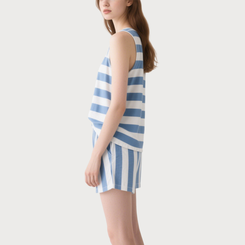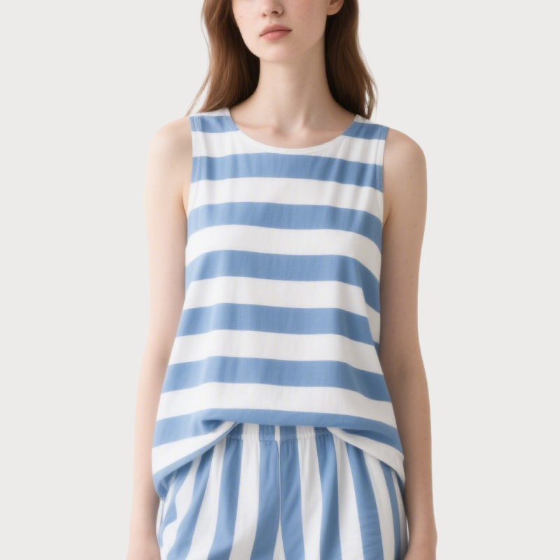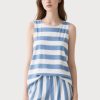 Top: Relaxed-fit sleeveless tank in blue and white horizontal stripes. Features a rounded neckline and cropped length for a breezy, polished look.