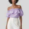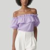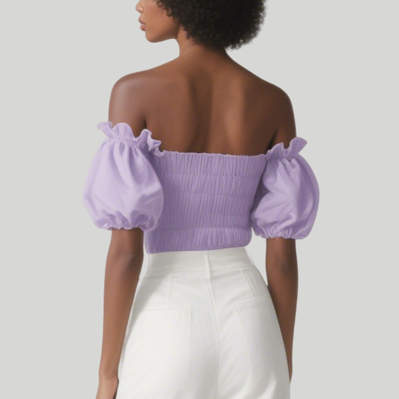Elevate your summer wardrobe with our Lavender Ruffle Off-Shoulder Blouse, a blend of effortless elegance and structured charm.