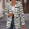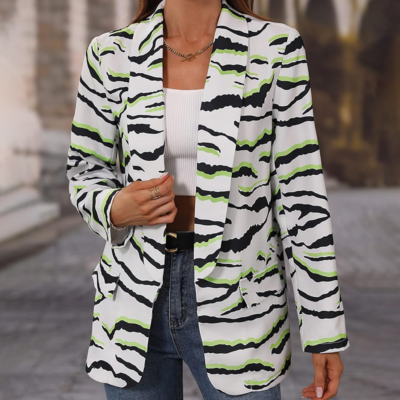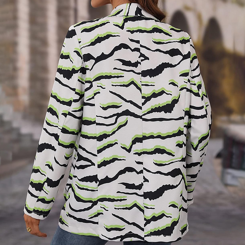 The jacket adopts an open design, which is easy to put on and take off and match. The print and lapel design add visual appeal and fashion elements. The design is fitted, highlighting the body line, adding fashion sense and feminine charm.