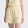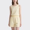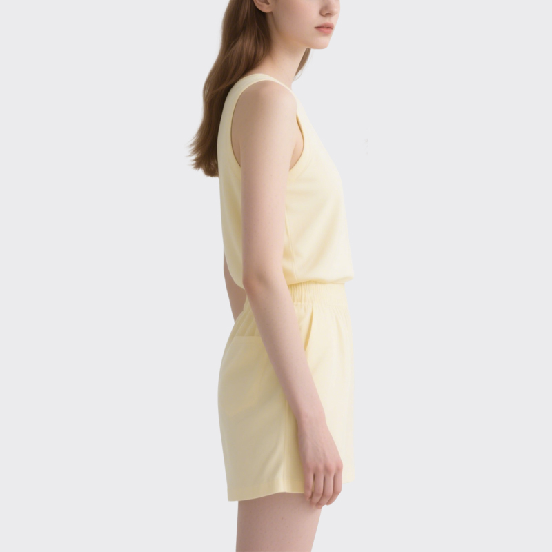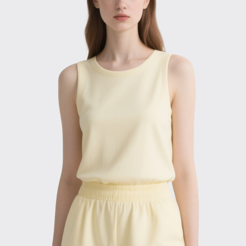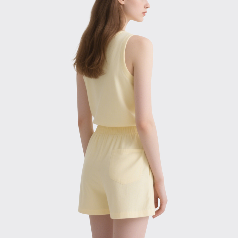 Effortless Design: Soft yellow crew-neck tank top paired with mid-thigh shorts for a relaxed, put-together look.
