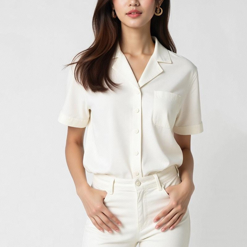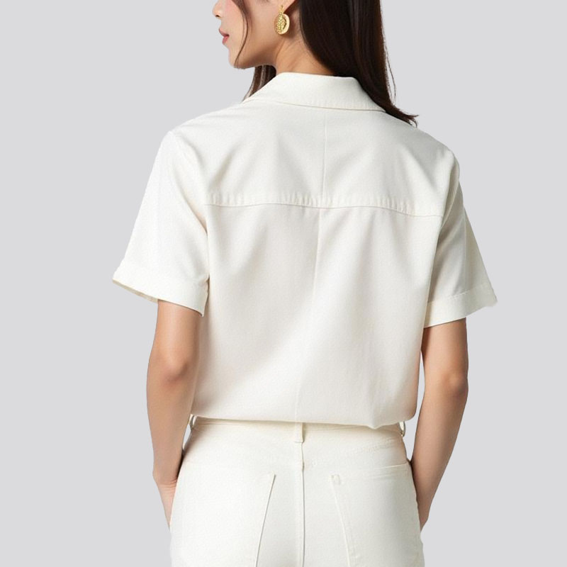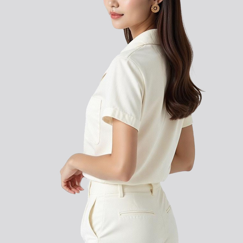 Moderate hem length, lapel collar, short sleeves. The women’s shirt is comfortable and beautiful, while the design is simple and fashionable.